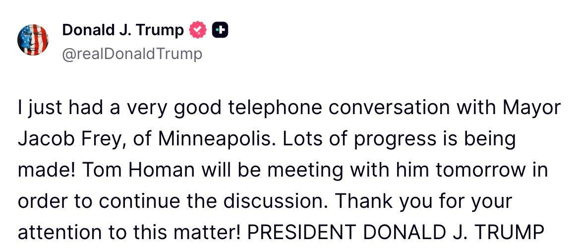 Trump had a ‘VERY GOOD’ phone call with Minneapolis Mayor JACOB FREY ‘Lots of progress is being made!’ 'Tom Homan will be meeting with him tomorrow in order to continue the discussion’ Trump also had a ‘VERY GOOD’ call with Gov. Walz