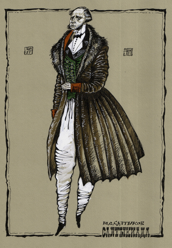 — 10 лет назад отмечалось 190-летие писателя. Тогда и была проведена первая выставка, на которой я представил «Салтыкиаду». Впоследствии на основе выставки была создана пьеса — попурри из произведений Салтыкова-Щедрина с вкраплением его писем и фактов биографии. Согласно сюжету, молодой Салтыков встречается со своим вторым «я» — купцом-старообрядцем Щедриным. В результате появился великий русский сатирик.