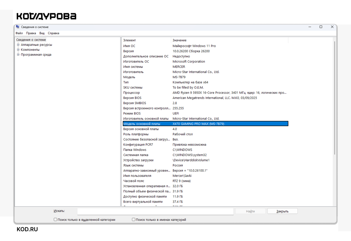 Больше новостей об IT в Telegram канале «Код Дурова» Материнская плата — это основа вашего компьютера, сложнейшее устройство, объединяющее процессор, видеокарту и память в единый организм. Обычно о ней не вспоминают годами, но ровно до того момента, пока не встаёт вопрос об апгрейде или ремонте. Рассказываем, как узнать, какая материнская плата стоит на компьютере. Знание точной модели — это не просто техническая справка, а необходимость в следующих ситуациях: В Windows есть всё необходимое, чтобы узнать модель платы за несколько секунд. Это самый наглядный способ для обычного пользователя: Более быстрый и надёжный способ без графических окон: Иногда встроенные средства Windows показывают скупую надпись «To Be Filled by O.E.M.». Это значит, что производитель не заполнил данные в системе. В этом случае помогут специализированные утилиты. Этот способ незаменим, если операционная система не загружается или не установлена. Можно вообще не запускать систему, достаточно лишь взглянуть на сам