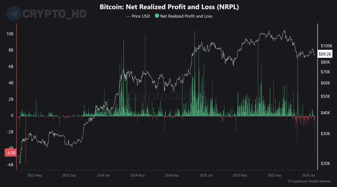 🧸 CryptoQuant: Реализованные убытки по BTC – максимум за три года (-$4,5b).