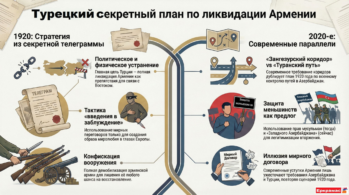 - Упоминание в документе 1920 года необходимости «удерживать в своих руках все дороги, соединяющие Турцию с Азербайджаном», перекликается с современным требованием создания «коридора», что отражает давнюю турецкую мечту о «Туранском пути», соединяющем тюркские республики Центральной Азии с Турцией.