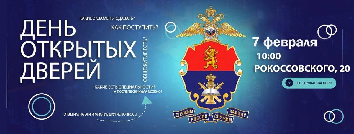 🚔🎓 📅 Когда: 7 февраля 2026 года (суббота) ⏰ Во сколько: 10:00 📍 Где: г. Красноярск, ул. Рокоссовского, 20 (главный корпус) Тебя ждет полное погружение в жизнь института: ✅ Интерактивные площадки кафедр — почувствуй себя экспертом! ✅ Зрелищные показательные выступления наших спортсменов и консультации специалистов по прохождению вступительного испытания по физической культуре💪 ✅ Экскурсия по учебному заведению и жилым помещениям 🏢 ✅ Личное общение с преподавателями, курсантами и сотрудниками приемной комиссии — получи ответы на все вопросы о поступлении и обучении. Важно: для входа нужен паспорт (или иной документ). Предварительная регистрация не требуется. Это твой шанс изнутри увидеть, где рождаются лучшие специалисты для органов внутренних дел! Расскажи друзьям, бери родителей — и до встречи!
