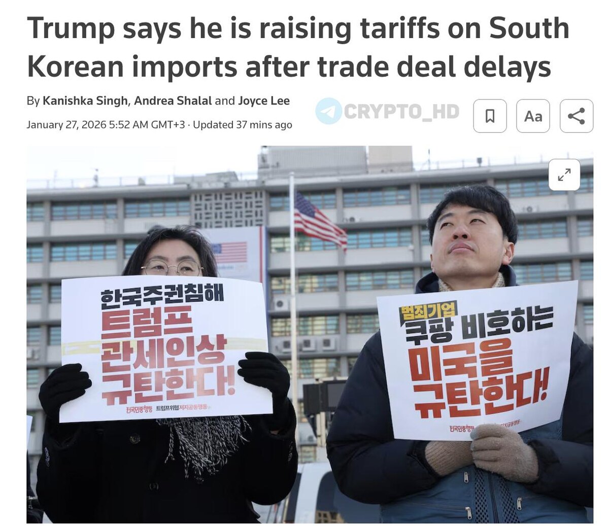 🇺🇸🇰🇷 Дональд Трамп заявил, что повышает торговые пошлины на импорт из Южной Кореи до 25%. Причина — парламент Южной Кореи до сих пор не утвердил торговое соглашение, достигнутое в 2025 году. Дата вступления в силу пока не объявлена. Crypto Headlines