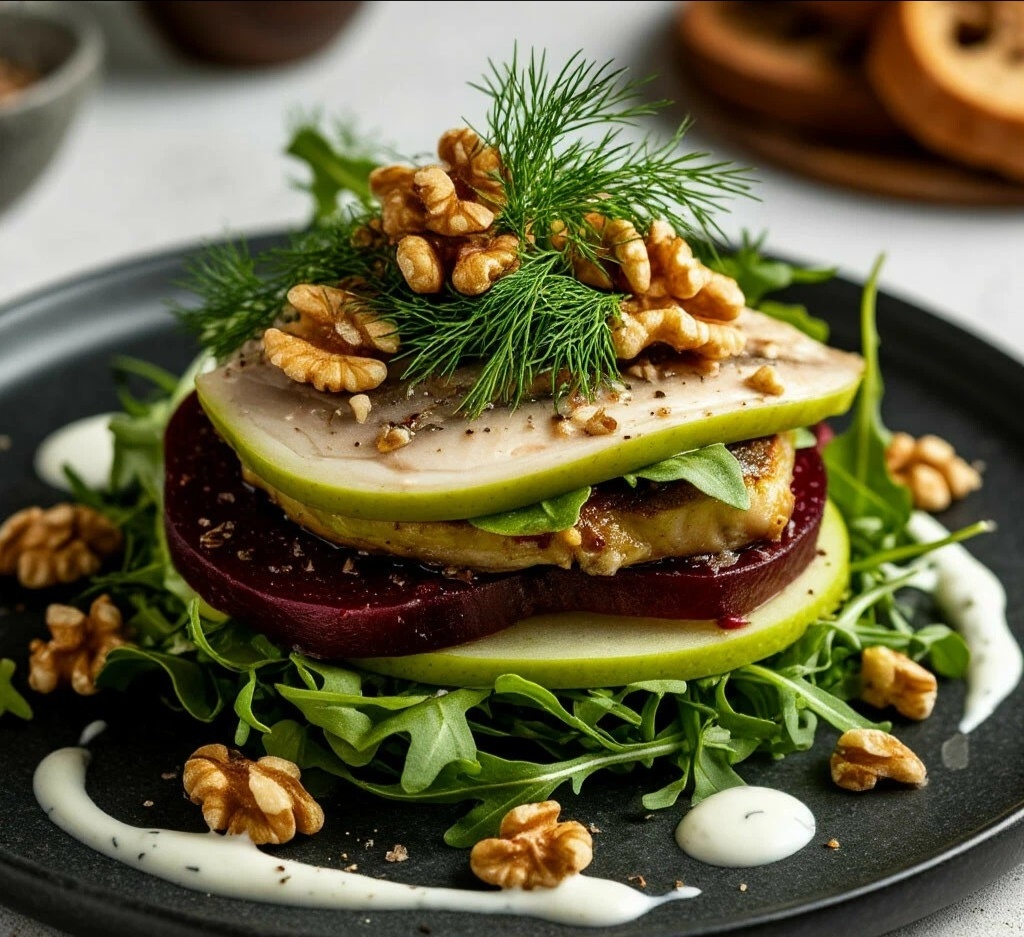 4. ✨ Подача: Полейте салат йогуртовой заправкой с хреном. Посыпьте рублеными грецкими орехами. Сбрызните оливковым маслом и ещё каплей яблочного уксуса. Подавайте сразу.