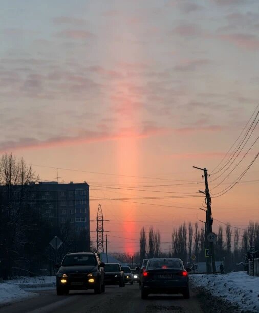 Морозы последних дней и ночей в Липецкой области возвели световые столбы. Это природное явление случается из-за отражения света от висящих в воздухе при сильных морозах плоских ледяных кристаллов. Они имеют форму горизонтально ориентированных тонких шестигранных пластинок. Свет от уличных фонарей, фар автомобилей, звёзд, Луны попадает на плоские кристаллы, отражается от них и создаёт вертикальные полосы света, напоминающие световые столбы. Словно лучи прожектора, бьющие в небо. Световые столбы возникли в Липецке, Ельце и сельских округах при солнечных закатах. Этому способствовала температура ниже -15 градусов, необходимая для образования кристаллов влажность и безветренная погода в Липецкой области в последние несколько вечеров. Фото Натальи Тюриной и паблика «Мой Елец | Новости»