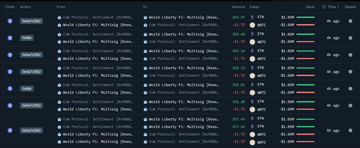 Криптовалютный проект World Liberty Financial (WLFI), поддерживаемый Дональдом Трампом, перевел часть своих активов из WBTC в ETH. Проект продал 93.77 WBTC (примерно $8 млн) и приобрел 2,868 ETH по средней цене $2,813 за монету. Этот шаг может быть связан с желанием получить прямой доступ к смарт-контрактам, стейкингу и инструментам DeFi, которые предлагает Ethereum. 📊 Ключевые моменты: - Продано: 93.77 WBTC ($8 млн) - Куплено: 2,868 ETH по $2,813 за монету - Причина: Доступ к функциям DeFi и стейкинга Ethereum. ⚠️ Риски: Переток средств не гарантирует долгосрочного ралли ETH; движение цен пока незначительно. Горизонт: краткосрочно/среднесрочно