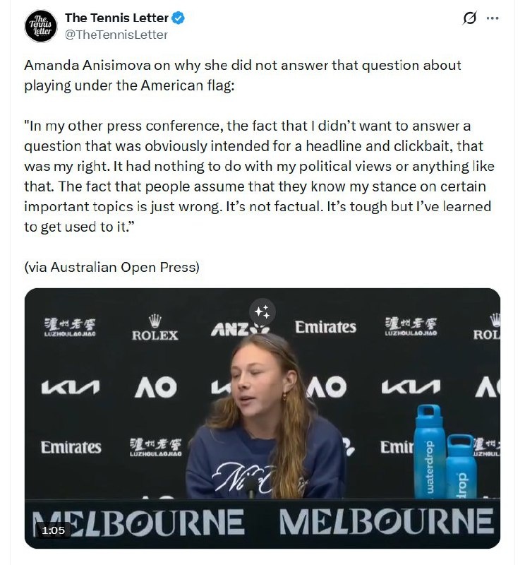 🎾 Amanda Anisimova объяснила, почему отказалась отвечать на вопрос об игре под американским флагом