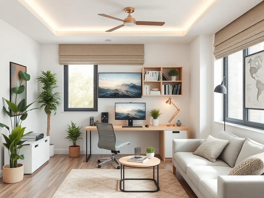 Домашняя спальня-офис: в небольших комнатах используйте вертикальное хранение и кровать с подъёмным механизмом, чтобы освободить площадь днем. Подвесные полки и аккуратные органайзеры помогут держать вещи в порядке, не загромождая пространство. Важно сохранить минимум личных предметов в поле зрения во время работы.