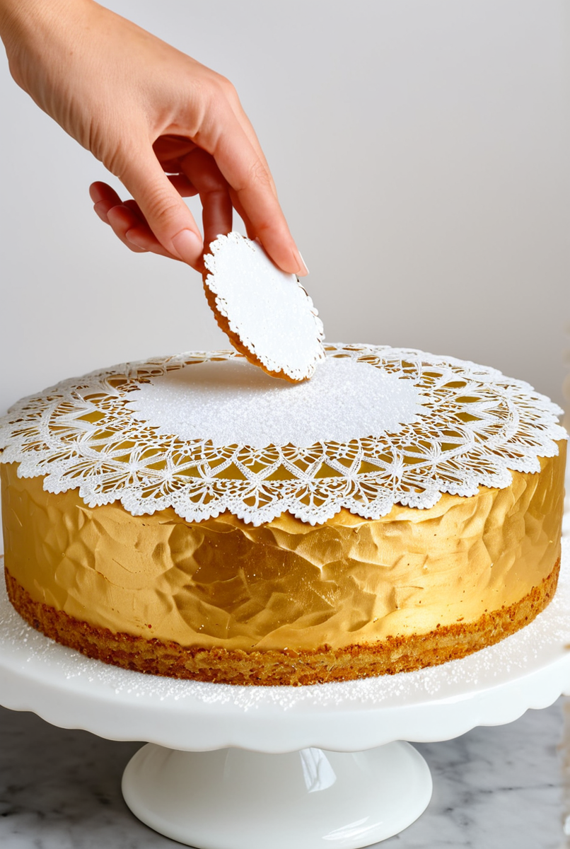- Аккуратно положите ажурную салфетку на поверхность десерта․