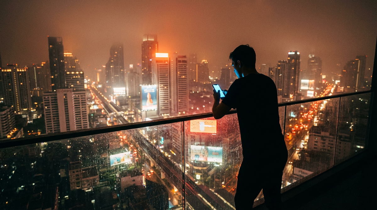 Ты стоишь на балконе своего кондо на 25-м этаже. Под тобой — океан огней, 10 миллионов человек, пробки, шум. Но в телефоне — тишина.