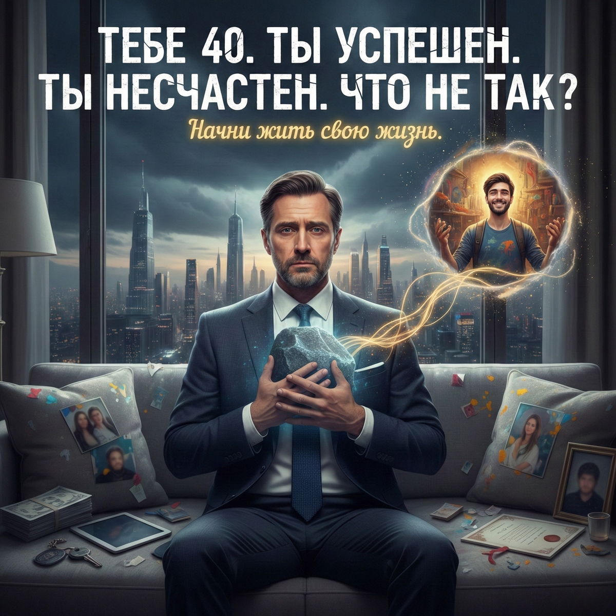 И самое больное — у тебя есть всё, что "должно" делать тебя счастливым. Карьера ✓ Деньги ✓ Семья ✓ Статус ✓