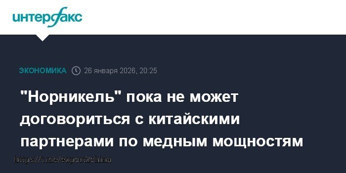 продукции. Интерфакс сообщает, что компания "Норильский никель", планирующая перенести мощности Медного завода из Норильска в Китай, столкнулась с задержками в возведении объекта из-за выхода с проекта местного партнера, передает агентство Bloomberg со ссылкой на информированные источники. Allesasia.com - Ваш помощник в бизнесе с Китаем https://www.interfax.ru/business/1069565