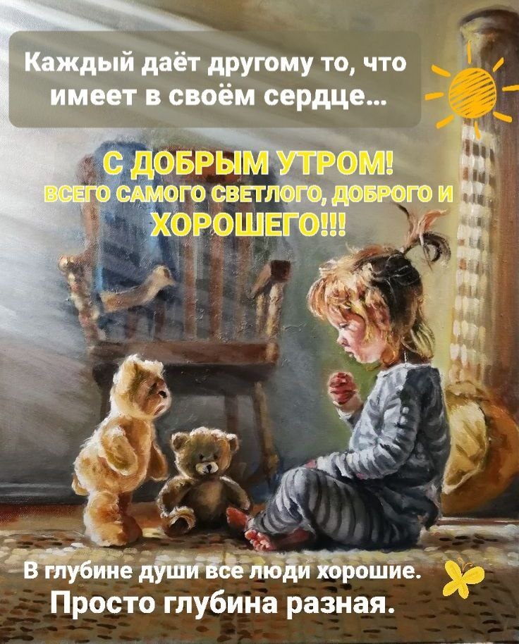 , Изменить свой уклад обычный — Съесть на завтрак яйцо и фрукты Вместо булки давно привычной; Покормить у подъезда кошек, Пусть «спасибо» и не услышишь; Птицам — хлебных насыпать крошек, Доброта не бывает лишней. Прогуляться пешком на работу, Позабыв про набитый транспорт, Рассмотреть красоту природы, Оказаться в волшебной сказке. Это просто — помочь старушке /Старику/ перейти дорогу, Для соседей — напечь ватрушек, Доброты не бывает много! Это просто — письмо отправить Не в e-mail (е), а так, по почте. Что-то в жизни своей исправить, Может быть, для начала — «почерк»?! И набрать позабытый номер, И сказать Человеку: «Здравствуй!», Даже если «сто лет» вы в ссоре… Доброта — это признак счастья. ______ Это просто — взглянуть в оконце, Даже если вдруг день ненастный, И увидеть, как светит солнце, И понять: твоя ЖИЗНЬ — ПРЕКРАСНА! © Светлана Чеколаева Доброе утро, друзья, делайте добро и оно к вам вернётся.