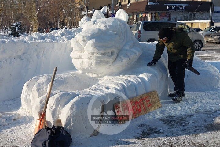 😍«Я просто рабочий»: мужчина с пилой и лопатой делает возле саратовского цирка фигуру тигра из грязноватого снега