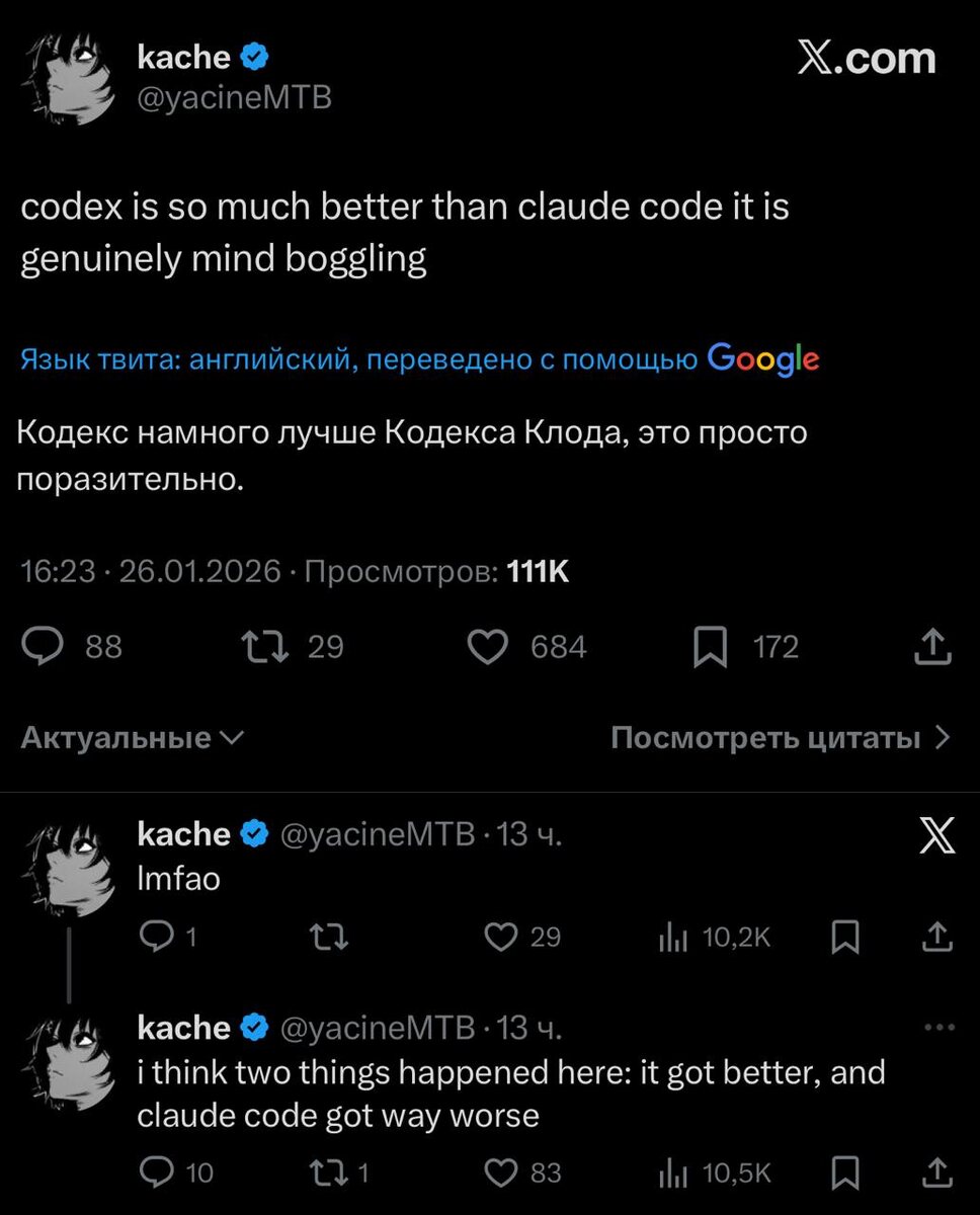 Как люди, что всю жизнь влюбленные в клод и опус открывают для себя джипити, причем далеко не последние Так ли это, абсолютно. Причем я представлен в не имею почему настолько лучше кодекс в сложных и комплексных задачах. Может эта его неторопливость действительно полезная Поразительно, что когда-то отстающий чат смог стать топ 1 с отрывом. Я до сих пор люблю и использую опус, считаю его лучшей проактивной моделью, накидать 8 новых фич - вперед. Но как только нужно что-то сделать сложнее - кодекс незаменим Еще обновления, что наконец добавляют множество важных и полезных вещей - например план мод недавний, что еще у экспериментах находится - но включить можно. Это очевидная и уже давно реализованная логика в Клоде только появилась, и даже в отсутствие таковых многие прямо заявляют о превосходстве - сабагенты, квизы, планы, столько всего появилось вот недавно - и столько всего еще нет, а она уже лучшая В общем, я рад за команду кодекс, спасибо вам за продукт