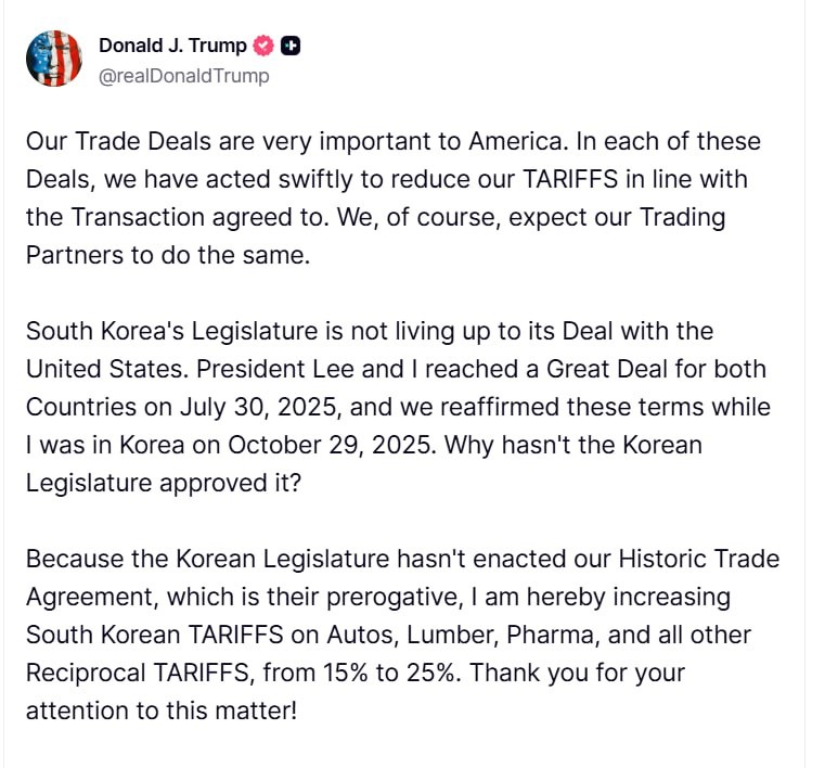 🇺🇸 Tramp Janubiy Koreya mahsulotlariga bojlarni 25 foizgacha oshirdi