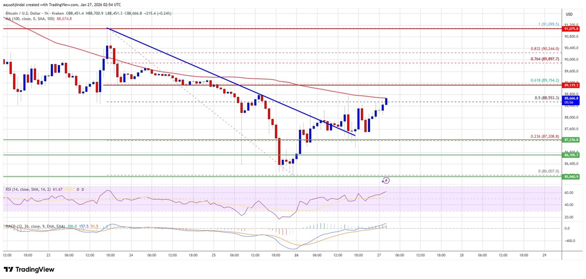 Цена биткойна пытается восстановиться после падения до $86,007, торгуясь около $88,500. Для продолжения роста необходимо преодолеть ключевые уровни сопротивления $88,800 и $89,500. На данный момент настроения на рынке осторожно оптимистичные, что подтверждается бычьим MACD и RSI выше 50. 📊 Ключевые моменты: - Текущая цена: около $88,500. - Поддержка: $88,000, далее $87,200 и $86,000. - Сопротивление: $88,800, $89,150 (61.8% Фибо), $89,500. - Прорыв медвежьей линии тренда на $88,000. - MACD в бычьей зоне, RSI выше 50. ⚠️ Риски: Неспособность удержаться выше $88,000 может привести к дальнейшему снижению до $86,000. Горизонт: краткосрочный