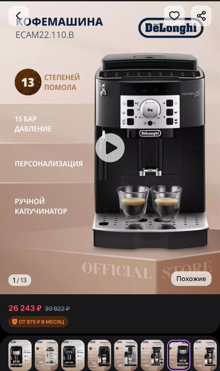 🔥 Кофемашина автоматическая Magnifica ECAM22.110.B DeLonghi за 26243₽