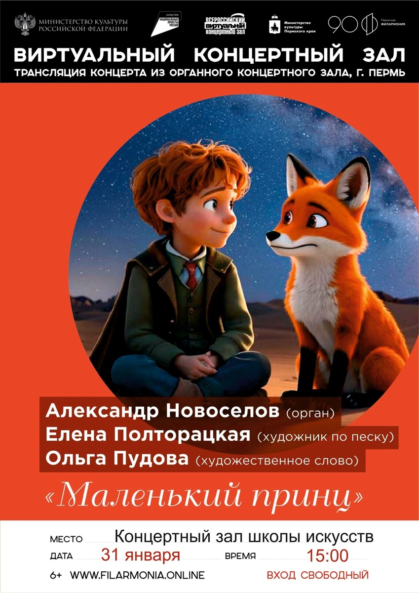 ✨ Увлекательным прочтением знаменитой сказки станет Музыкально-литературная композиция «Маленький принц», объединившая музыку, художественное слово и искусство песчаной анимации. Необыкновенная история оживёт в изложении замечательной рассказчицы – актрисы Ольги Пудовой и в волшебных картинах из песка художницы Елены Полторацкой. Сказочный мир станет ярче и красочнее с музыкальным сопровождением органиста Александра Новоселова. 📅31 января в 15:00 🌏Виртуальный концертный зал ЧДШИ ✅Вход свободный