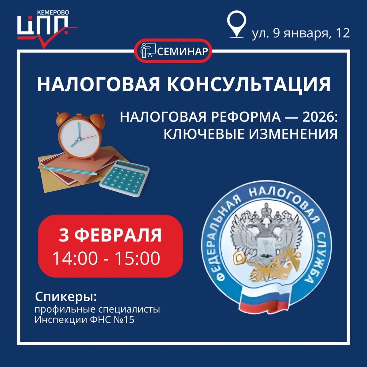 : 🔹ЕГРН: учет налогоплательщиков с 1 января 2026 🔹Переход на НДС для микро– и малого бизнеса: главный риск – не в самих налогах 🔹ПСН: изменение лимита доходов, розница и автоперевозки, уменьшение «физпоказателей» 🔹Камера, проверка, штраф: контроль отчетности в налоговой инспекции 🔹Декларационная кампания - 2026 📍Центр поддержки предпринимательства, ул. 9 Января, 12 (конференц-зал) 🗓03 февраля |14:00 – 15:00 Формат мероприятия: очно, бесплатно ✔️Регистрация Спикеры: профильные специалисты Инспекции ФНС №15 #Мероприятия_ЦПП