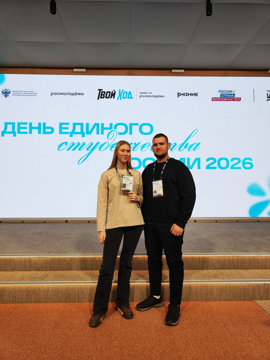 Студенты автомобильного факультета ВГЛТУ им. Г.Ф. Морозова Васильева Мария и Сысоев Антон стали участниками федерального образовательного мероприятия «День единого студенчества», которое состоялось 25 января в Москве на площадке Национального Центра «Россия». В рамках программы студенты обсудили ключевую роль молодёжи в социально-экономическом развитии страны, услышали мотивирующие истории успеха от практикующих предпринимателей и получили экспертные рекомендации по разработке и реализации собственных бизнес-проектов. Важным событием дня стал официальный старт шестого сезона Всероссийского студенческого проекта «Твой Ход». Проект реализуется Федеральным агентством по делам молодёжи (Росмолодёжь) при поддержке Министерства науки и высшего образования РФ и входит в президентскую платформу «Россия – страна возможностей» и национальный проект «Молодёжь и дети». Участие студентов ВГЛТУ в таких федеральных мероприятиях способствует их профессиональному и личностному росту, открывает возможно