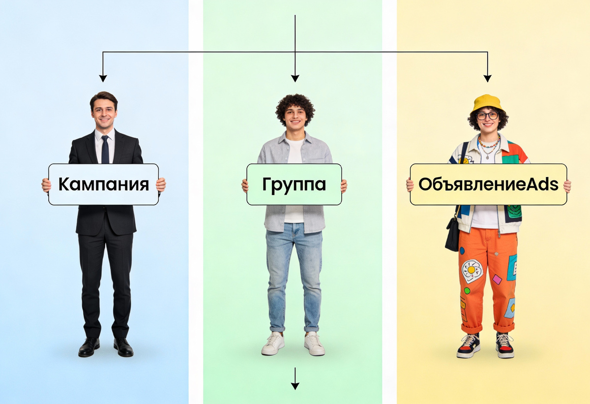 Чтобы реклама работала эффективно, она должна быть идеально структурирована. VK Ads использует классическую трехуровневую иерархию, которая позволяет тестировать гипотезы и управлять бюджетом с максимальной точностью. Понимание этой структуры — ключ к масштабированию и оптимизации. Кампания — это самый верхний уровень, который определяет глобальную цель и общий бюджет. Правило: Одна кампания = Одна бизнес-цель. Нельзя в одной кампании одновременно пытаться получить и лиды, и подписчиков. Группа объявлений — это уровень, который определяет аудиторию и места размещения. Это ваш "полигон" для тестирования гипотез. Правило: Одна группа объявлений = Одна гипотеза аудитории. Например, "Группа 1: Женщины 25-35, Интерес: Красота и здоровье" и "Группа 2: Мужчины 30-45, Интерес: Бизнес и финансы". Объявление — это самый нижний уровень, который определяет креатив и текст. Это то, что видит пользователь. Правило: В каждой группе объявлений должно быть минимум 3-5 разных объявлений (креативов) для