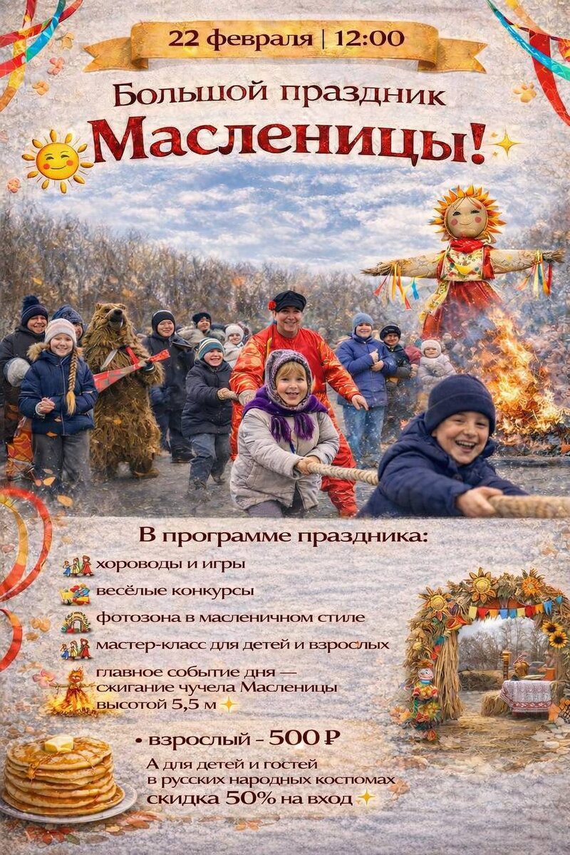 ! 22 февраля 12:00 в парке Аистово- большие масленичные гуляния, где шумно, весело и по-настоящему по-русски! Это не просто праздник- это прощание с зимой, смех, огонь, хороводы и ощущение, что весна уже совсем рядом 🌸 Зовите семью, друзей, надевайте народные платки и шапки- будем гулять, радоваться и встречать весну вместе. 🕕Начало в 12:00 🔥 Главное событие дня- сжигание огромного чучела Масленицы (5,5 метров!) 🕝 14:30 Огонь в этот день- символ очищения и прощания со всем плохим: тревогами, усталостью, холодом и зимними заботами. Ярко, зрелищно и по-настоящему символично. 🎉 В программе праздника: • народные хороводы и традиционные игры • весёлые конкурсы для детей и взрослых • мастер-классы для всей семьи • масленичная фотозона для атмосферных снимков • живые эмоции, смех и настоящий праздник 🕛 Начало программы: с 12:00 🎟 Вход: 500 ₽ 👧 Дети и гости в народных костюмах: 250 ₽ Будет громко, радостно, по-семейному и тепло- даже если зима ещё не сдалась. Приходите проводить