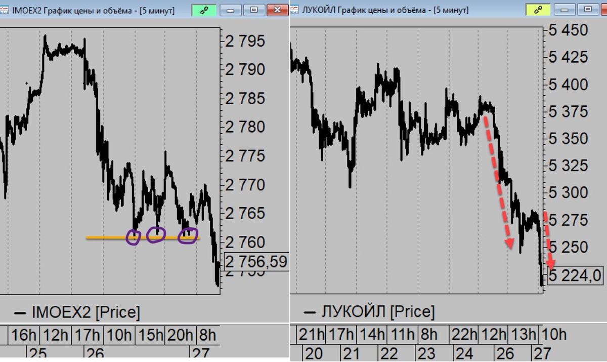 Разворот от 2760 наверх, был бы чисто бычьим сценарием. ОТ уровня отскакивали три раза вчера и пытались расти. каждый раз на закрытиях били вниз. Сегодня основные бумаги моего портфеля растут на данный момент, но индекс падает. Валят практически одним Лукойлом его... Который начал падать очень внезапно и не без объяснений почему именно Лук и именно сейчас под таким давлением. Так что очень внимательно смотрим за этой лакмусовой бумажкой рынка. На рынке важный уровень - поддержка 2750. Лакмус - Лук.