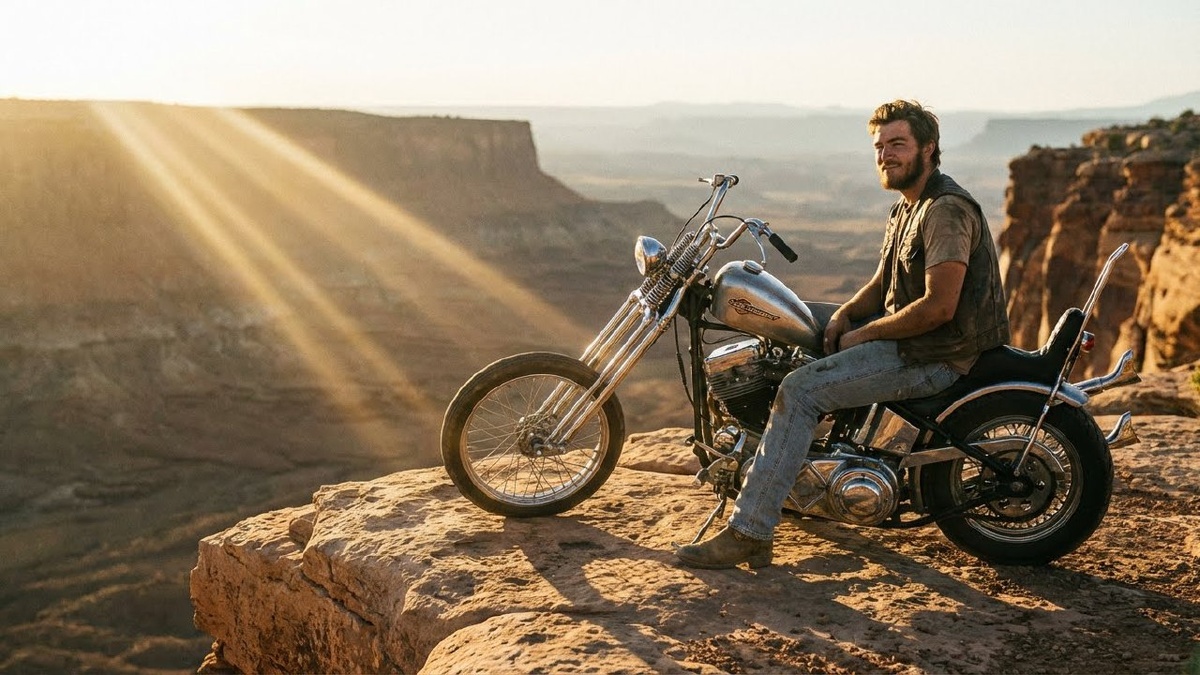 Динамика и статика в байкер-портрете (Photoshoot Duo) Когда одна фотография — это история, а две, связанные общим героем и местом, — уже целая сага. Эти промпты — готовая формула для создания парных портретов, которые раскрывают характер с разных сторон: в действии и в моменте осознанной уверенности. 🔑 Ключ 1 (Динамика): Ультрареалистичная фотография, фотосессия в стиле байкер-портрет. Молодой парень в кожаной жилетке и поношенных джинсах сидит верхом на полированном чоппере Harley-Davidson, держась за руль. Мотоцикл стоит на самом краю пустынного обрыва с видом на каньон. Ясный летний день, время "золотого часа", солнце светит сбоку, создавая длинные драматические тени. Выражение лица уверенное, с лёгкой ухмылкой, взгляд направлен вдаль, за кадр. Ощущение скорости, свободы и лёгкой бунтарской энергии. Снято на камеру с телеобъективом 135mm f/2.0, малая глубина резкости. --ar 4:5 --style raw --stylize 170 🔑 Ключ 2 (Статика): Ультрареалистичная фотография, фотосессия в стиле байкер