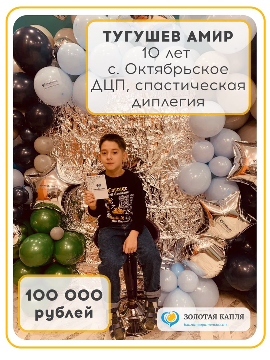 ! Друзья, нашим подопечным стал десятилетний Амир Тугушев из села Октябрьское Пензенской области. У мальчика ДЦП, спастическая диплегия. Амир родился недоношенным, весом всего 1200 граммов. Первые месяцы его жизни были борьбой за каждый вздох. Позже был поставлен диагноз ДЦП. Но благодаря упорным реабилитациям, в 4 года Амир начал ходить самостоятельно. Каждый курс даёт результат: снижается мышечный тонус, увеличивается двигательная активность. Амир доказал, что прогресс возможен. Но чтобы он не останавливался, занятия должны быть регулярными. Очередной, жизненно важный курс реабилитации стоит 100 тыс. рублей. Давайте поможем Амиру вместе! ➡️Сбор 100 000 рублей на реабилитацию в ФОЦ «Необаланс» г Пензы. 🔸Помочь просто с помощью кнопки в закрепленном сообщении канала