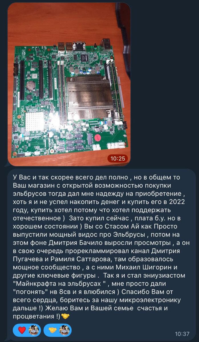 - это даже не десятки человек, а больше, что весьма существенно для отрасли На скрине очень приятный и важный для меня отзыв, что я делал все правильно Жаль, что у нынешнего руководства МЦСТ нет желания идти на контакт с гражданами нашей страны, а наоборот: любую информацию заставляют удалять, угрожая натравить ФСБ😶 Будь у ребят больше смекалки - давно бы позвали меня, условным, советником в МЦСТ и столько бы хороших дел смогли сделать, реально продвинуть в массы российскую архитектуру еще больше, создав настоящую народную разработку ПО под Эльбрус Но, к счастью, в стране есть адекватные разработчики процессоров: Байкал Электроникс, Курчатовский Институт - НИИСИ (Комдив), YADRO, Миландр, КМ211, Аквариус, Сбер и еще много кто, о ком не уверен, что можно упомянуть) Может быть им я буду полезен, ведь и мне хочется дома работать на компьютере под управлением РОССИЙСКОГО ПРОЦЕССОРА Желательно, произведенного в Российской Федерации😉 Ну а с моим ресурсом данную задачу будет реально