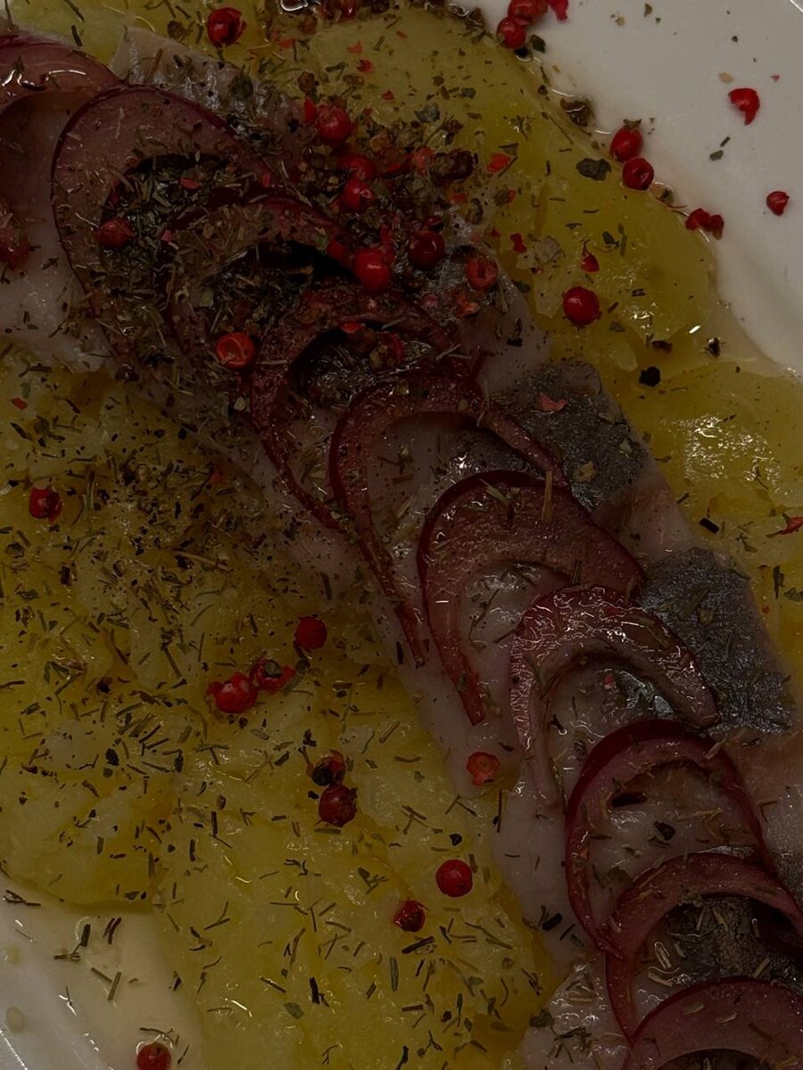 Три килограмма за два дня ВСЁ. Селедку полила нераф подсолнечным маслом с запахом жареной семечки, сверху сушенный укроп, розовый перец и зеленый, лук крымский красный плоский и самый сладкий замариновала в винном уксусе. И рада. Больше ресторанных рецептов и лайфхаков в моем тг-канале.