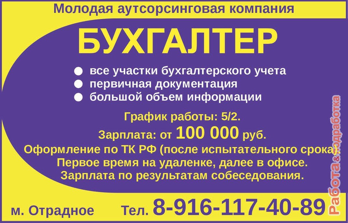 !📌 💳 Ищем квалифицированного бухгалтера с отличной репутацией и безупречным опытом! ✅ Что мы предлагаем: - Официальное трудоустройство и конкурентную зарплату от 100 000 рублей. - Удобный график работы: пятидневка с возможностью удаленки. - Профессиональный рост и дальнейшее сотрудничество в нашем дружном коллективе. 📌 Минимальные требования: - Уверенное ведение всех участков бухгалтерского учета. - Экспертиза в работе с первичной документацией и составлении отчетов. 📞 Наш адрес: - Метро Отрадное. - Телефон: 8-916-117-40-89. 💥 Почему выбирают нас: - Наши специалисты работают в комфортных условиях и имеют стабильный доход. - Вы станете частью команды профессионалов, которые ценят точность и пунктуальность. 🎯 Если вы мастер своего дела и хотите добиться большего — присылайте резюме и присоединяйтесь к нашей команде! Работа&Подработка «Жизнь — игра, а деньги — способ вести счет.» — Тед Тёрнер #бухгалтер #бухгалтерша #главныйбухгалтер #бухгалтерия