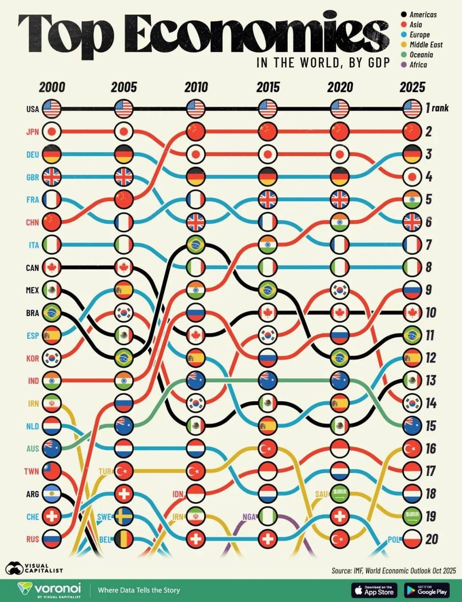 📈🇨🇳 Инфографика, которая кричит громче любых аналитических отчетов! 🔥 Посмотрите, как за 25 лет изменился ландшафт мировой экономики 🌍 😀 2000 год: Доминирование традиционных гигантов 🇺🇸🇯🇵🇩🇪 😀 2025 год: На сцену выходит новый лидер, меняющий баланс сил Ключевой тренд, который видно невооруженным глазом — стремительный и неудержимый взлет Китая 🚀 Линия Поднебесной уходит так высоко, что скоро может начать свой собственный график! ❓ Вопрос на засыпку: А где же на этом графике восходящая звезда — Индия 🇮🇳? И как вела себя экономика России 🇷🇺 на фоне всех этих изменений? А что вы видите на этой карте? Пишите в комментариях! 👇 #экономика #Китай #визуализация #мироваяэкономика #тренды