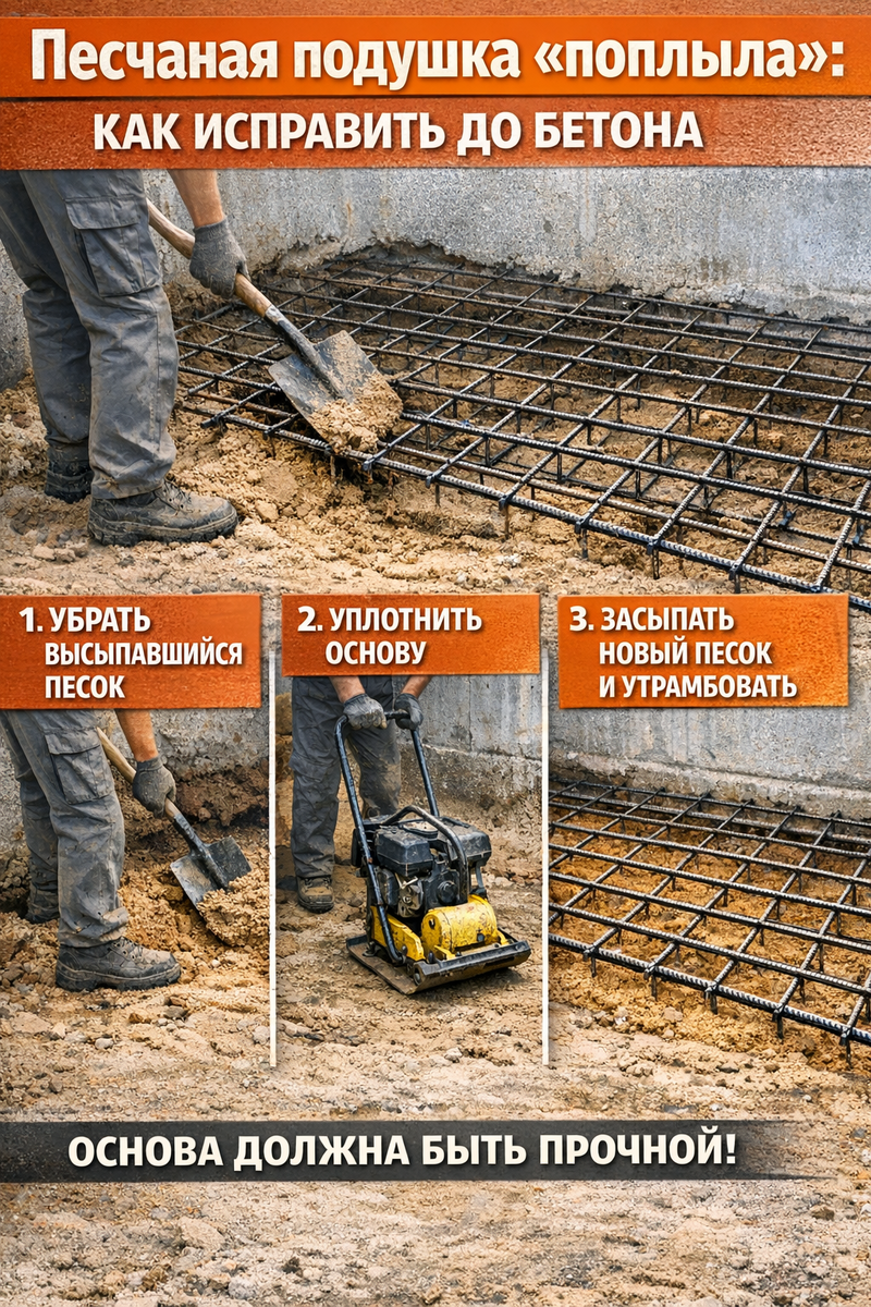 Почему это важно: размокший песок — это уже не подушка, это смесь с водой и мелочью, которая после высыхания даст пустоты и разную плотность. А разная плотность — это разные осадки, которые бетон прекрасно передаст дальше.