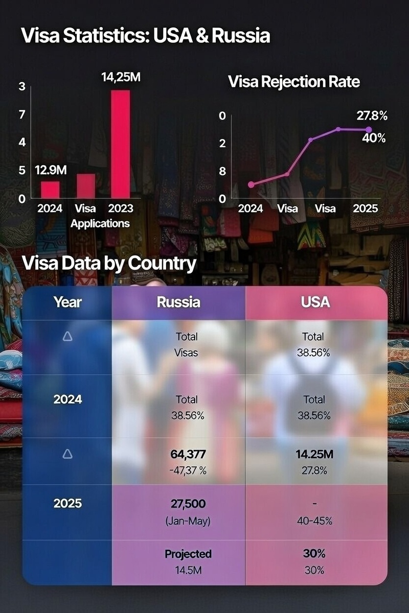 .... виз, из которых 59 .... составили неиммиграционные, а 5 .... — иммиграционные. Уровень отказов по визам B1/B2 для российских заявителей составил 3.....%, что существенно превышает среднемировой показатель. Текущие данные за 2025 финансовый год (октябрь 2024 – сентябрь 2025) носят предварительный характер, однако ежемесячная статистика выдачи ключевой категории B1/B2 демонстрирует следующую картину...., уже на сайте VCP Travel