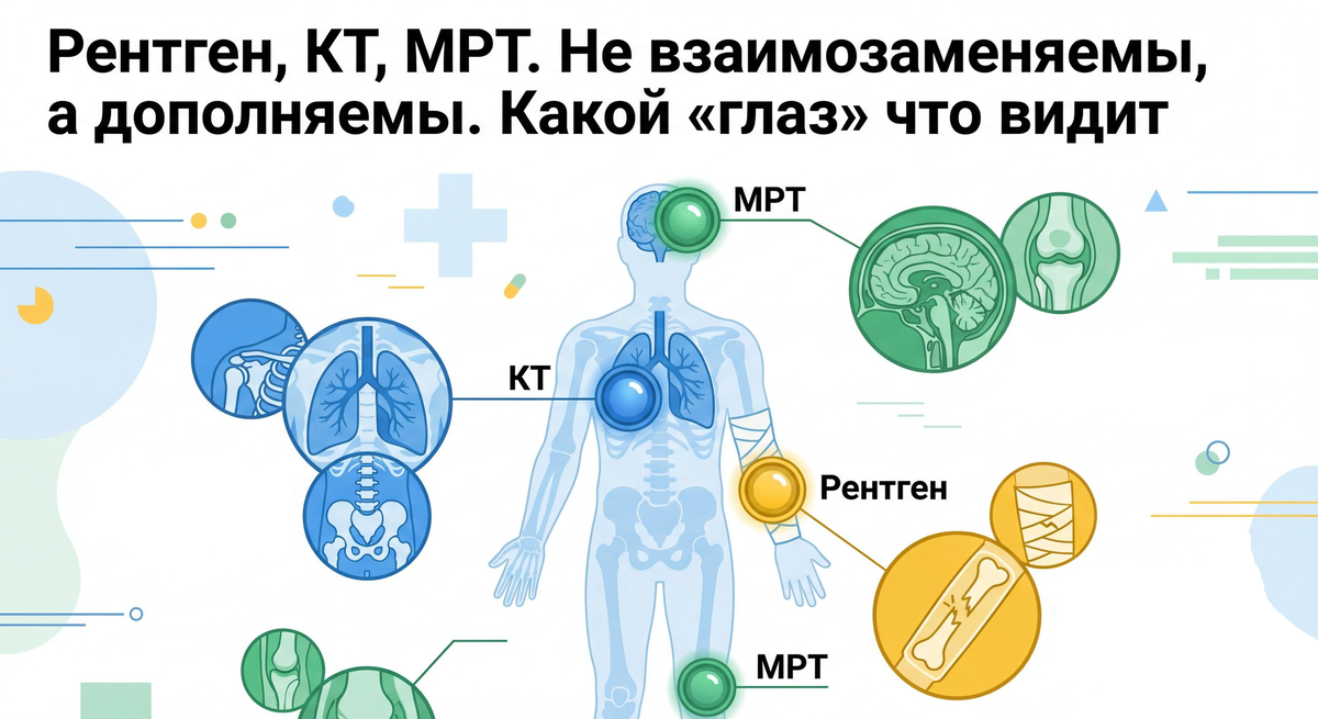 Понимать основы - не значит ставить диагноз вместо врача. Это значит быть осознанным участником процесса, знать правильные вопросы и снимать лишнюю тревогу. Давайте составим ваш личный словарь, где на простом языке разберём трёх главных шпионов организма: рентген, КТ и МРТ.