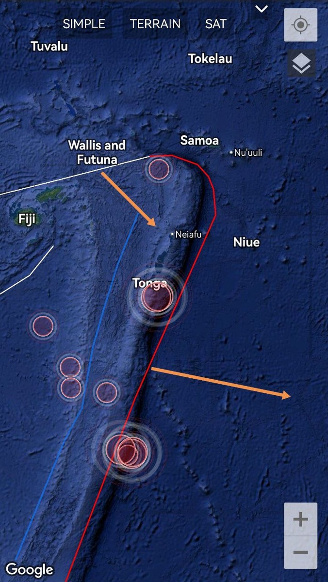 Здесь сформировался ОСТИ, трассирующий местную рифтовую зону с поворотом против часовой стрелки. По протяженности облачная структура допускает потенциальную магнитуду до М7.8 +/-0.2 В течение 9 дней есть вероятность сильного землетрясения по данной зоне. ===== Strong tectonic stress and M4-5+ marker seismic activity are observed in the northeast of the Australian Plate in Oceania. A CSTI has formed here, tracing the local rift zone with a counterclockwise rotation. The length of the cloud structure allows for a potential magnitude of up to M7.8 +/-0.2 There is a possibility of a strong earthquake in this area within 9 days.