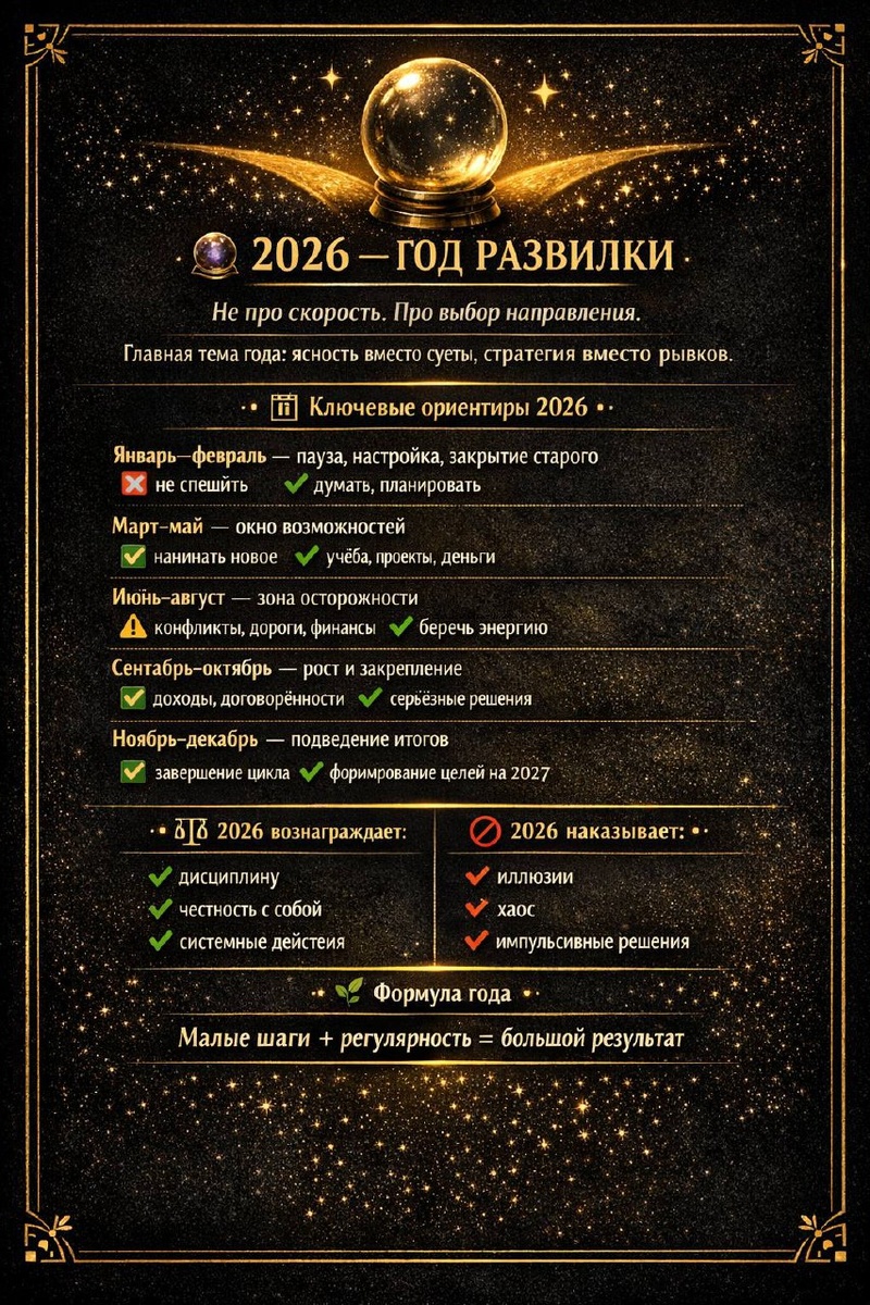 Посмотрел свежее видео от Астролога Тамары Глобы. Дал задание своему ИИ помощнику (Терминатору) выписать главные моменты из интервью и упаковать в конкретную инструкцию. У меня всё совпало в 25м году, что она рекомендовала в 24м. Подготовил для вас методичку и картинку для печати и повесить на холодильник. Одна лишь мысль, которую я вам хочу донести: если есть хоть малюсенький шанс, что это сработает, то надо быть глупцом, чтобы не попробовать. Ведь я ничего не теряю. А в случае, если сработает, то мне плевать, что обо мне подумают. Далее думайте сами - двигаться по-новому или залипать в своей правоте и убеждениях. Если тебе не комфортны слова ДИСЦИПЛИНА, СТРАТЕГИЯ, ПЛАНИРОВАНИЕ, то приходи на Марафон, и мы вместе с тобой пройдем 30-дневный курс исцеления от твоей прокрастинации и ты выйдешь из тумана на свет. Присоединяйся по этой [ссылке]. Чтобы забрать прогноз на 2026 по знакам зодиака, переходи по этой [ссылке]. * не забудь про постер
