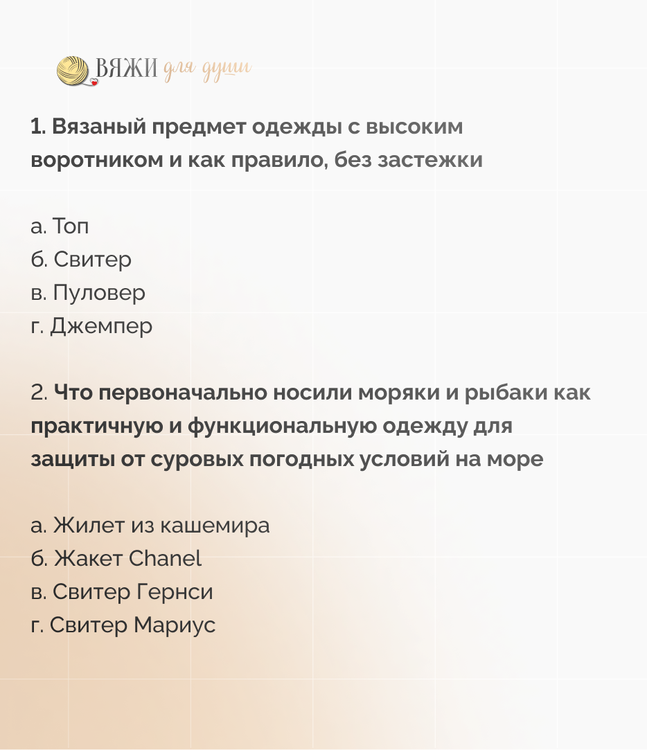 Подготовили для вас несколько вопросов по эфиру, который прошел 25 января. Сможете ответить на все? Свитера и кардиганы в стиле Гернси — это ведь история совсем не про высокую подиумную моду, которая часто бывает оторвана от жизни. Это изделия с особой философией! ♥️ Комфорт: это одежда, которую хочется носить каждый день, не снимая. Она создана для жизни, движения и тепла. ♥️ Продуманная конструкция: Традиционный крой Гернси (например, использование ластовиц) гарантирует идеальную посадку по фигуре, а сами изделия вяжутся логично и легко. ♥️ Универсальность: Несмотря на свои исторические корни, такие свитера абсолютно "базовые". Они вписываются в любой образ: от классических брюк до простых джинсов. Всегда выглядят достойно и уместно. ♥️ Практичность: Это та самая "рабочая лошадка" в гардеробе джентльмена и леди😉, которая будет радовать удобством в повседневной носке годами. Ну что, ответили на все вопросы? 😉