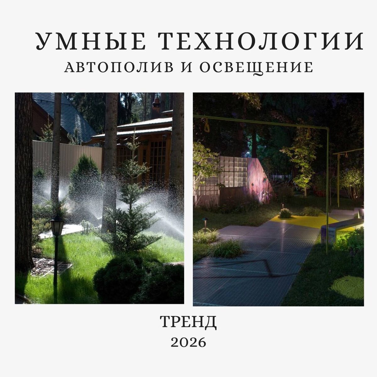 Устали от бесконечных хлопот с лейкой и поисками выключателя в темноте? Мы создаём сады, которые заботятся о себе сами — с помощью умных технологий автополива и освещения Что мы используем в своих садах и почему люди все чаще выбирают полив и свет «по расписанию»? 🟡Умный автополив — основа заботы о растениях Мы используем ⬇️ Профессиональные системы с метеодатчиками, контроллерами и капельным поливом Плюсы⬇️ Растения получают влагу точно по графику и в нужном объёме — даже в ваше отсутствие Вы экономите до 50% воды и навсегда забываете про шланги и тяжёлые лейки 🟡Автоматическая подсветка — магия в вашем саду Мы используем⬇️ Энергоэффективные светодиодные светильники с датчиками движения и сумеречными контроллерами Плюсы ⬇️ Свет включается сам, когда стемнеет или когда вы выходите в сад Представьте: вы наслаждаетесь идеальным садом — политым, освещённым и красивым в любое время суток. А вокруг необыкновенный аромат трав, бушующая зелень и потрясающее цветение. Невероятно, пра