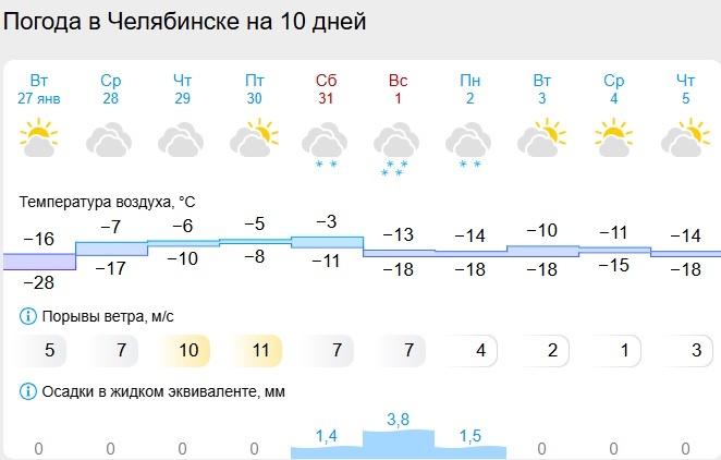 Сегодня жителей региона ожидает последний морозный день на неделе. Потом погода на Южном Урале станет более мягкой. Челябинск Погода. По информации Челябинского ЦГМС, сегодня, 27 января, в Челябинской области ожидают местами небольшой снег, а на отдельных участках дорог вероятна гололедица, поэтому автомобилистам нужно быть предельно внимательными во время поездок. Также днем во вторник по региону будет от -15 до -20 градусов, а в горах – до -12 градусов. А уже к концу рабочей недели в Челябинской области установятся температуры, которые больше соответствуют весне. Так, по долгосрочным прогнозам с портала Gismeteo.ru, в Челябинске в пятницу ожидают -5 градусов днем, а в субботу – до -3 градусов. В Магнитогорске погода окажется чуть холоднее, но самым теплым днем также станет суббота, 31 января. В этот день в городе металлургов ожидают до -5 градусов. В Миассе в пятницу и в субботу ждут до -4 и до -3 градусов соответственно. А особо теплым оказался прогноз по Златоусту – в городе крылат