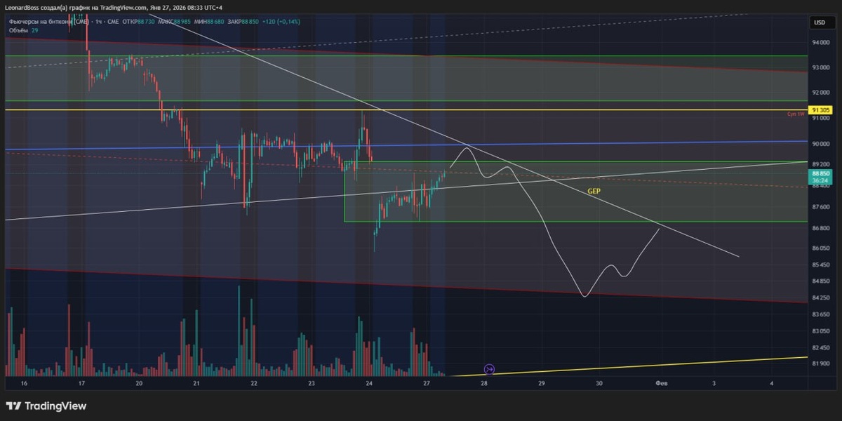 )😎 27 января 2026 года. 8:27 Dubai 💸 Биткоин: 88.730$ 🔼 🕯 Объем торгов: 228млрд$ 🕯 Ликвидации: 742млн$ P.s. ✔️ GEP практически перекрыт = задание можно считать выполненным, сверху уровень 90К и логичный сценарий повторного отката, возможно просто на ретест нижней границы GEPа! ✔️ETH ожидаемо поехал за "батей" и пока еще не действует, как лицо самостоятельное, а лишь показывает зависимость, хотя график к BTC довольно надежный после отката! ✔️Объем рыночных торгов находится в стабильном рабочем состоянии выше уровня 200, что указывает на возвращение в рынок активных игроков, а ликвидации продолжают находится на повышенных значениях, и теперь уже снова "спасибо" шортистам, набивая мешки биржам! ✔️ В мире пока относительно спокойно, я имею ввиду новых витков напряженности и конфликтов. При этом флот США уже находится в зоне возможной атаки Ирана, Хамении тем временем в бункере, а старый пират "Т" на удивление молчит = значит вот вот что-то ляпнет или сделает, надо быть готовы