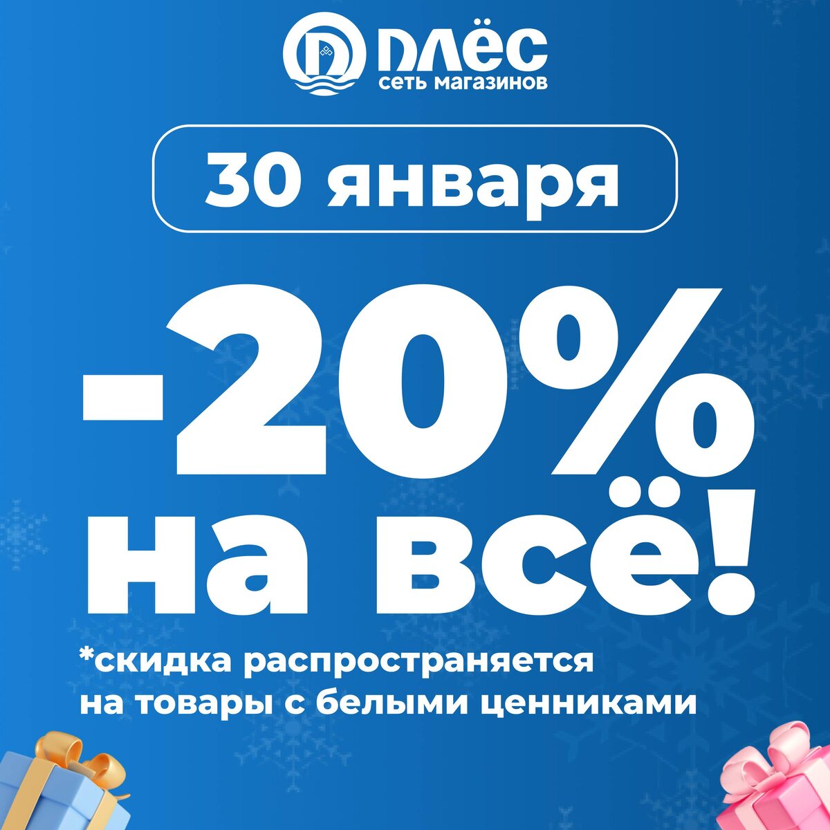 ❗️Внимание! 30 января в сети магазинов «Плёс» действуют скидки -20% на весь ассортимент😱