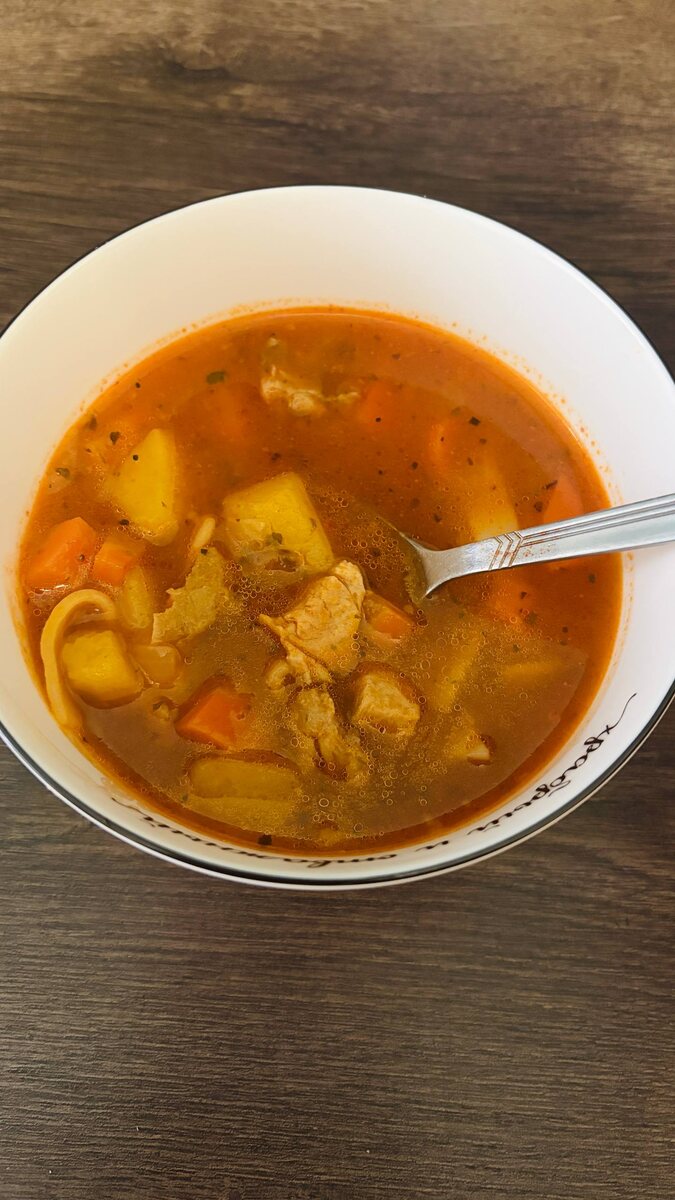 Ингредиенты: Картошка Морковь Лук Болгарский перец Лапша для лагмана Мясо на кости Томатная паста Приготовление: Варим мясо. Я через 5-10 минут после закипания сливаю воду, наливаю чистую и варю на втором бульоне с лавровым листом и солью. Когда мясо готово, достаем его, снимаем с костей, мелко режем и возвращаем в кастрюлю. На сковороде обжариваем лук и крупно порезанную морковь. Затем добавляем порезанную картошку. Еще нужно добавить болгарский перец, но у меня его не было. Обжаренные овощи закидываем в суп, добавляем томатную пасту и варим почти до готовности. В конце закидываем лапшу (я беру Шебекенскую для лагмана). Солим, добавляем специи (я добавила смесь кавказских трав). #суп
