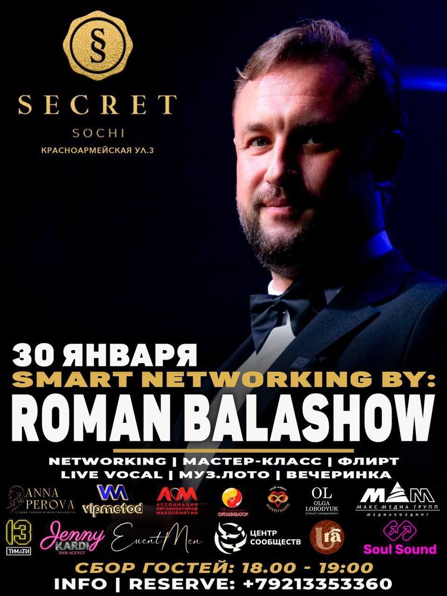 ! Рад пригласить вас на Networking от Романа Балашова в формате светского вечера 30го Января 2026 года в ресторане Secret (Красноармейская 3) 1. Live Vocal - София Sitnika 2. Мастер-класс: Голос, как инструмент увеличения продаж (Роман Балашов) 3. Мастер-класс: Развитие интеллектуальных способностей: Спикер Николай Ягодкин 4. Networking и флирт 5. Музыкальное лото 6. Дискотека 7. Празднование дня рождения Романа Балашова Сбор гостей: 18.00-18.30 Фото/видео отчет Info/Reserve: @De_nisOsin Пост согласован с Администрацией