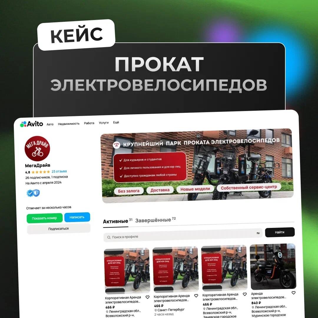 Прокат электровелосипедов Компания: МегаДрайв Ниша: прокат электровелосипедов ГЕО: СПБ, ЛО, Тамбов, Смоленск Боли: слабые результаты с Авито, постоянные блокировки. Важный нюанс: клиент подготовил новый аккаунт, специально для нашей работы. Определили ЦА и сформировали УТП ЦА Курьеры УТП - Только новые модели - Запас хода до 120км - 2 аккумулятора в комплекте - Вместительный багажник - Персональный менеджер Провели фотосессию с настоящим курьером❗️ Создали продающие заголовки и тексты Использовали больше 14 уникальных заголовков. Например: «Аренда электровелосипедов для курьеров с выкупом» «Прокат электровелосипедов /Электровелосипед аренда» «Аренда электровелосипедов для курьеров c выкупом / Прокат электровелосипедов / Электровелосипед u2» В текст объявлений добавили следующие преимущества: • Крупнейшая сеть офисов 🗺️ + 2 сервис-центра 🔧 • Только новые велосипеды: лучшие модели 2025 года 📃 • Прокат электровелосипедов для граждан любой страны (СНГ) 🌍 • Аренда велосипед