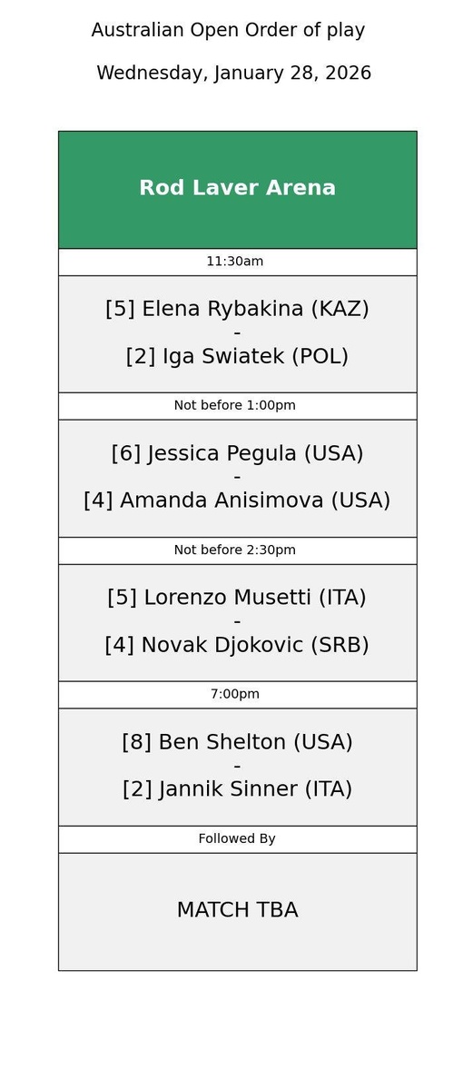 : 🎾 Елена Рыбакина (Казахстан) - Ига Швентек (Польша) - 11:30 🎾 Джессика Пегула (США) - Аманда Анисимова (США) - не раньше 13:00 🎾 Лоренцо Музетти (Италия) - Новак Джокович (Сербия) - не раньше 14:30 🎾 Бен Шелтон (США) - Янник Синнер (Италия) - 19:00 Подпишись на Эйс и точка