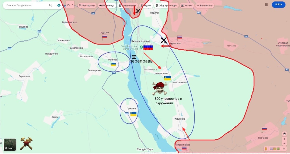 МО РФ: Освобожден Купянск -Узловой, идет зачистка. 800 военнослужащих ВСУ находятся в окружении, это примерно 2 полнокровных батальона. Так же идет штурм Глушковки и Ковшаровки. Вражеская группировка "Заосколье" входит в стадию разгрома. схемы и карты
