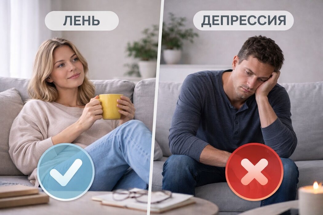 Статья для тех, кто хочет лучше понимать своё состояние и относиться к себе бережнее. Мы часто используем слово «лень», когда что-то не делается. Но за этим словом могут скрываться разные состояния - от обычной усталости до эмоционального истощения. Иногда человек говорит «я ленюсь», хотя на самом деле ему тяжело, а не «не хочется». Но как отличить одно от другого? 1. Лень - это про «не хочу», депрессия - про «не могу» При лени есть энергия, но нет желания. При депрессивном состоянии - желание может быть, но нет сил включиться в действие. 2. Лень - кратковременна, депрессия длится дольше Лень обычно ситуативна: усталость, отсутствие интереса, нежелание начинать. Депрессивное состояние держится днями, неделями, и даже месяцами. 3. После отдыха лень проходит, депрессивное состояние - нет Если после сна, выходного дня, или небольшого перерыва становится легче - это усталость или лень. Если облегчение минимально или отсутствует вообще - это сигнал внутреннего истощения. 4. При лени интерес